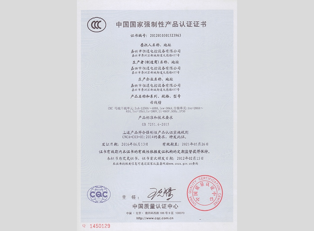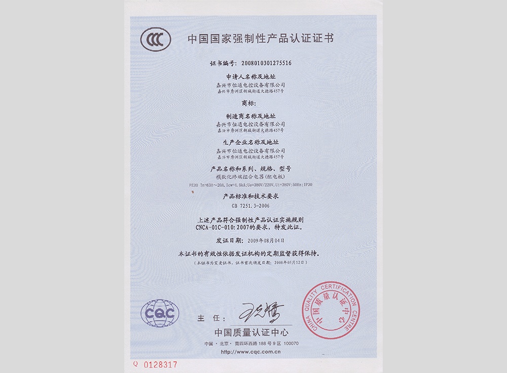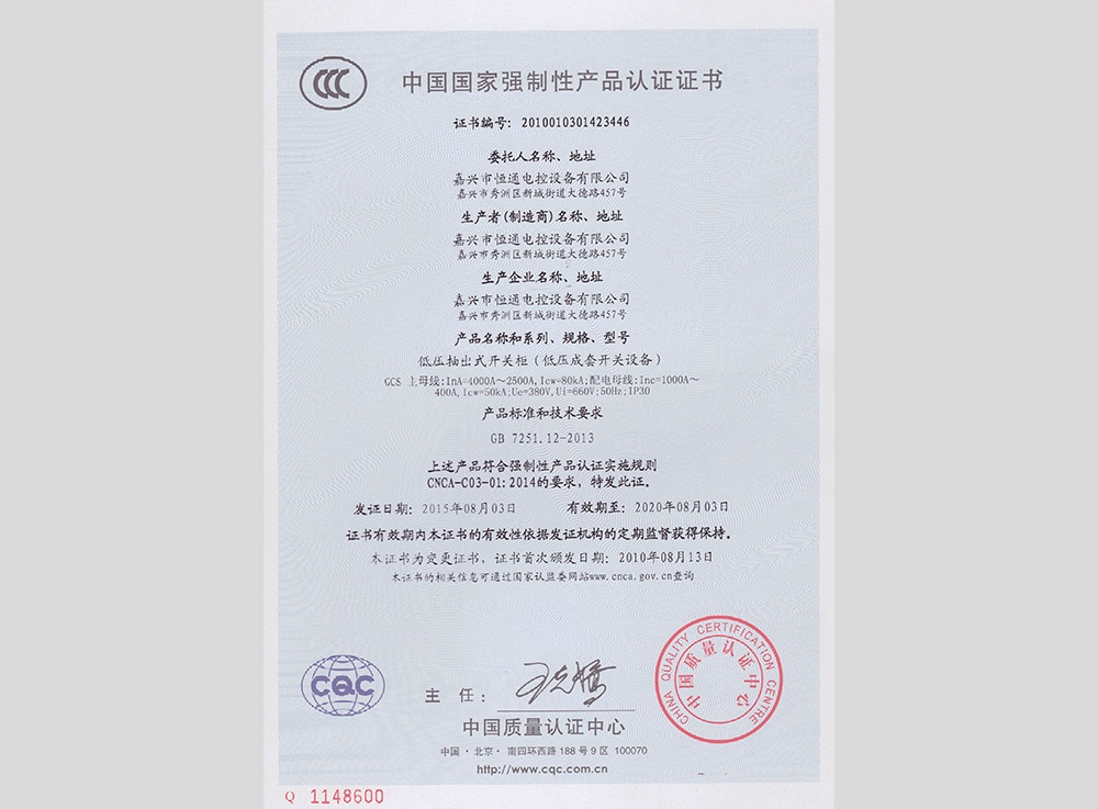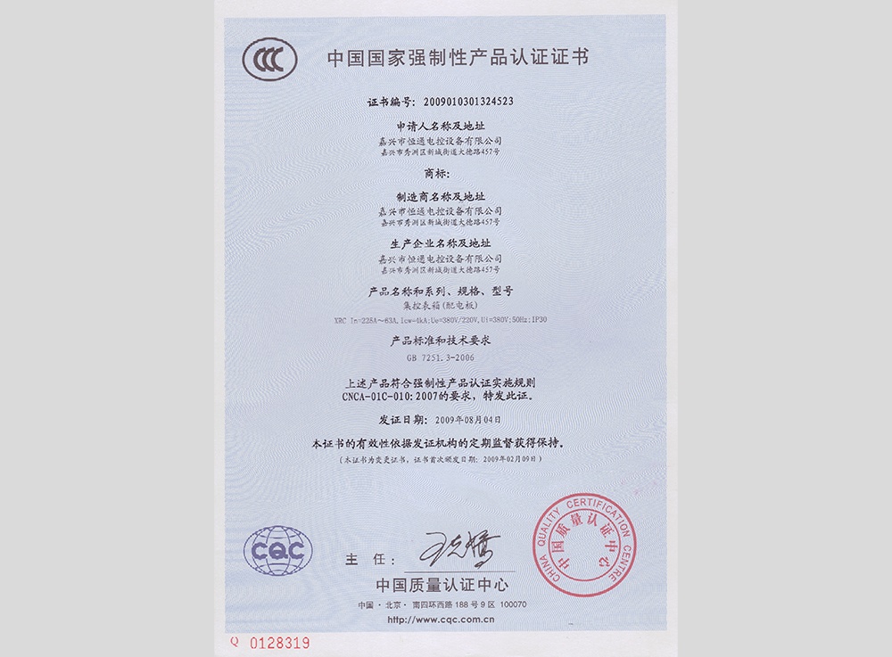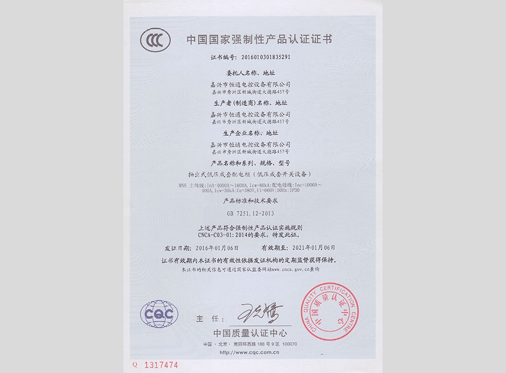 認領"3C"證書及型式試驗報告,產品分別有:高低壓 箱式變電站XBW、高壓中置柜KYN28、抽出式低壓 成套配電柜MNS、低壓抽出式開關柜GCS、低壓配 電柜GGD、電容補償柜GGJ、母線槽CMC、集控表 箱XRC、玻璃鋼集控表箱XRD、低壓動力柜XGL、電 纜分支箱HWF、低壓配電箱XRL、模數化照明箱PZ30。